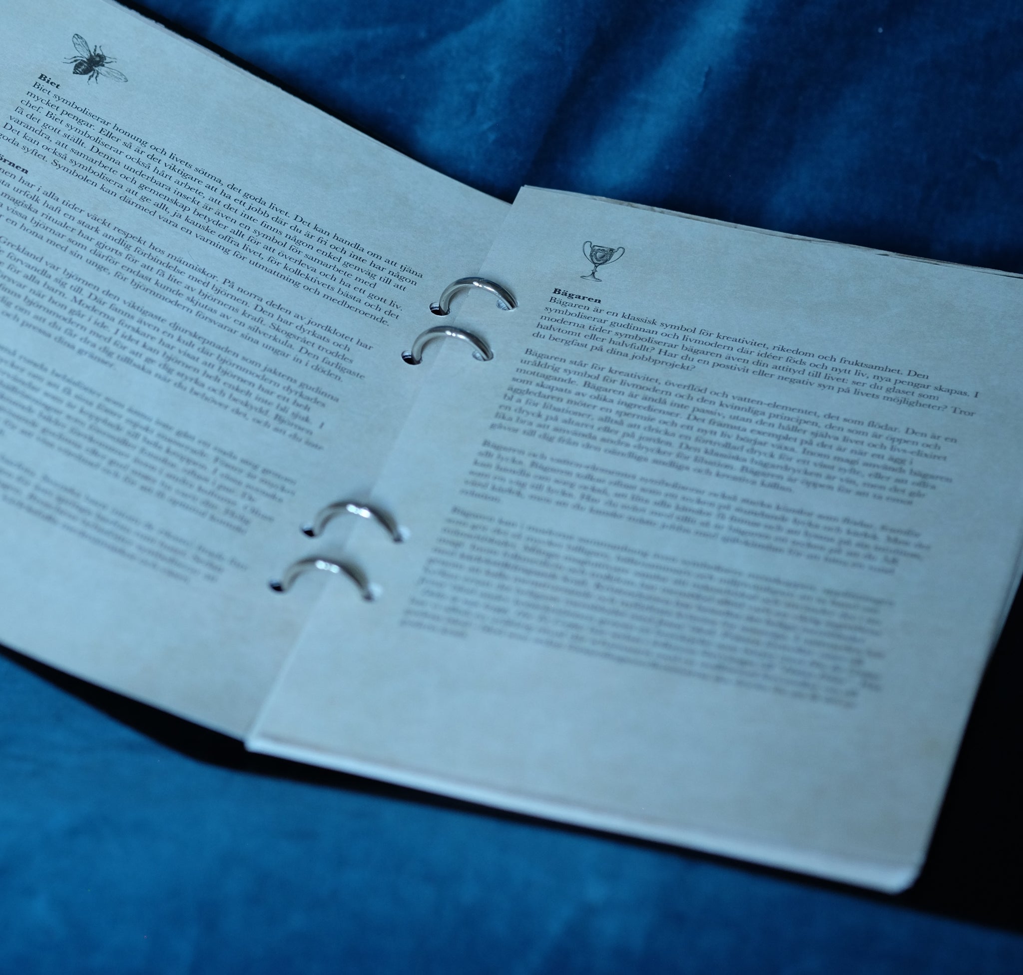 Med symbol-kitet följer ett exklusivt symbollexikon som jag har skrivit. På ett trettiotal blad tolkar jag varje symbol efter uråldriga globala traditioner och egen erfarenhet. Du får även kunskap om respektive symbolhistoria. Du måste inte följa lexikonets tolkningar i din spådom, men det kan vara en fin vägledning. Läs mer i lexikonet om hur du kan använda symbolerna och duken.