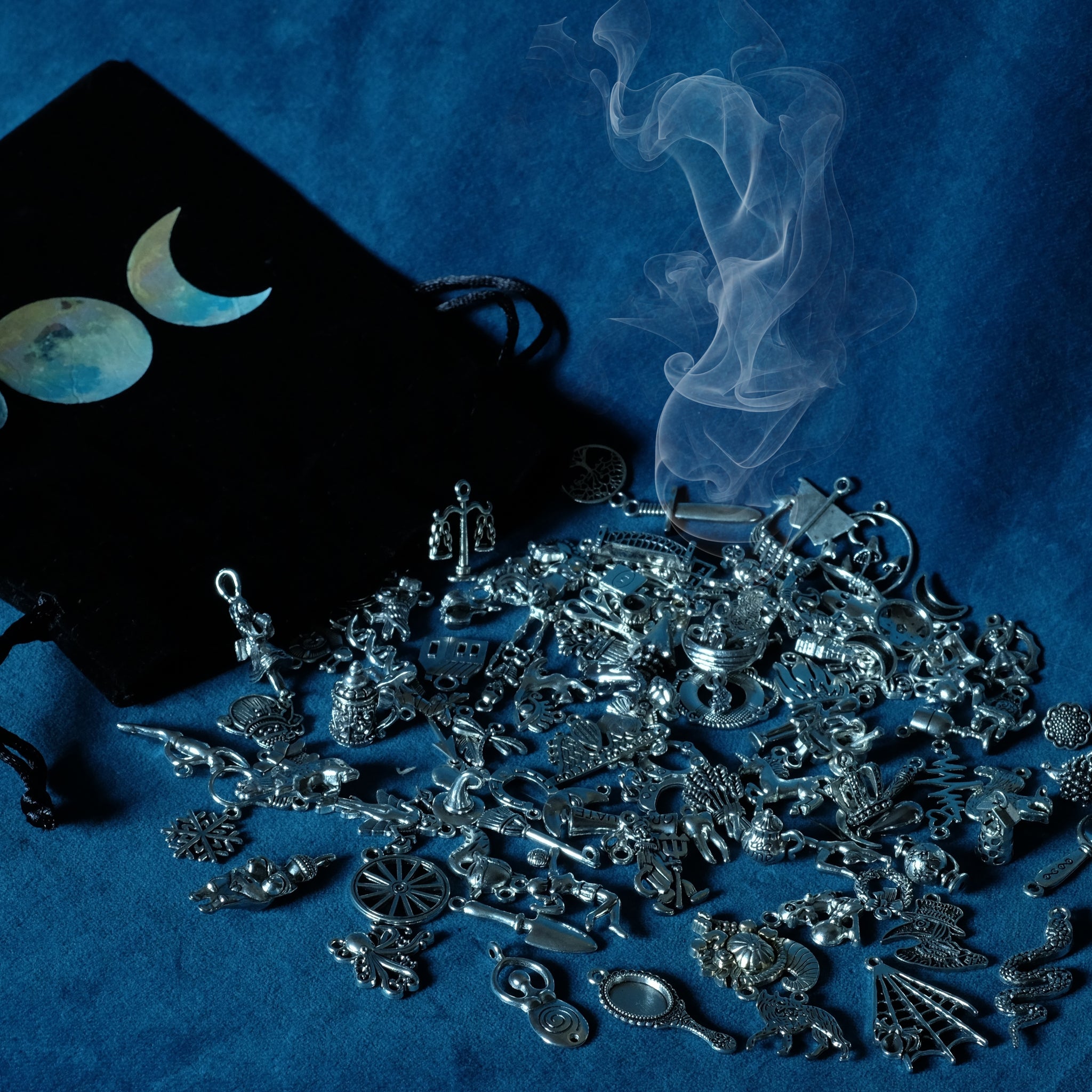 De silverfärgade och i princip outslitliga symbolberlockerna ligger i en fin svart sammetspåse med trippelmånen tryckt på utsidan (påsens mått är 13x17 cm) . Berlockerna kan också användas som smycken. Du kan såklart lägga ner egna symboler i påsen också. Små pryttlar från byrålådan och finurliga minifynd från stranden får då ny funktion.
