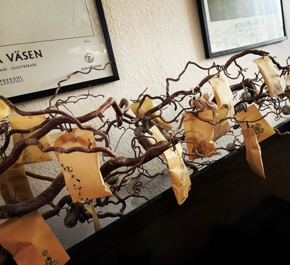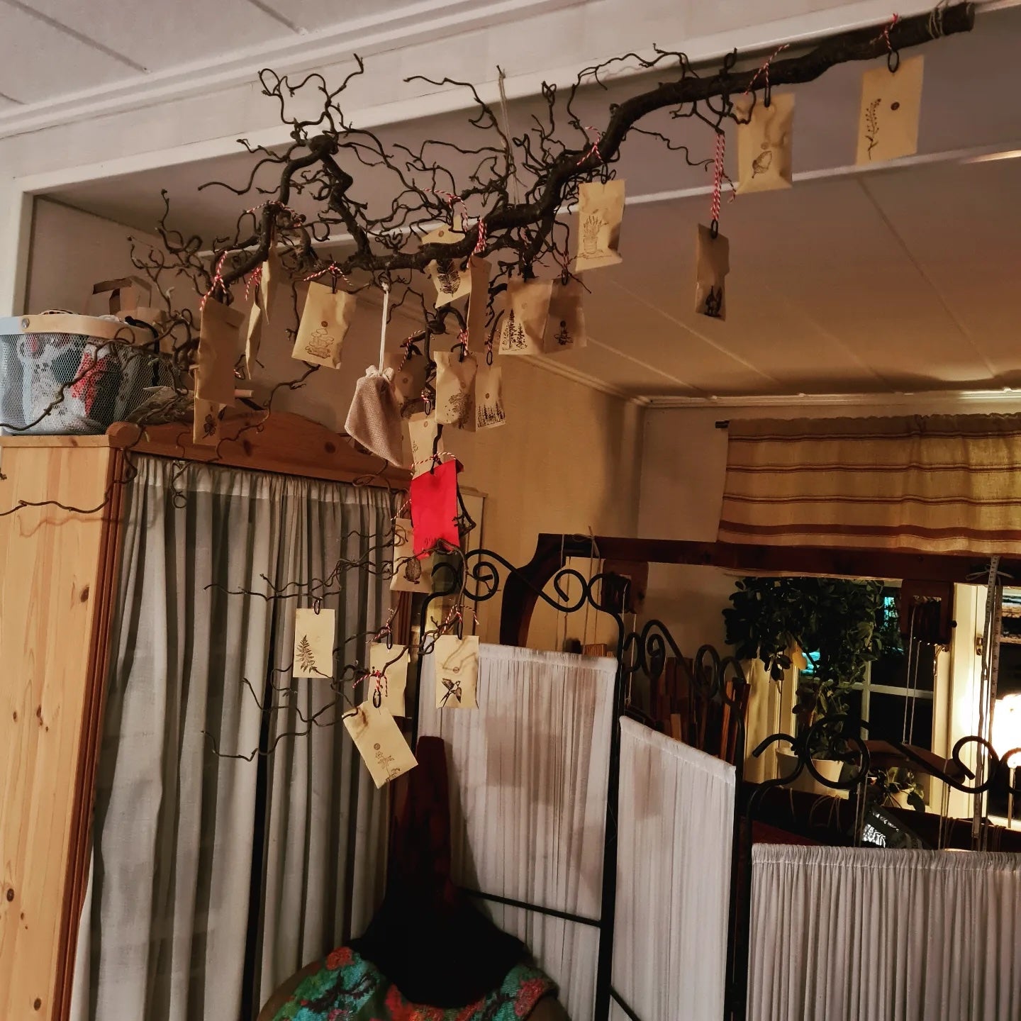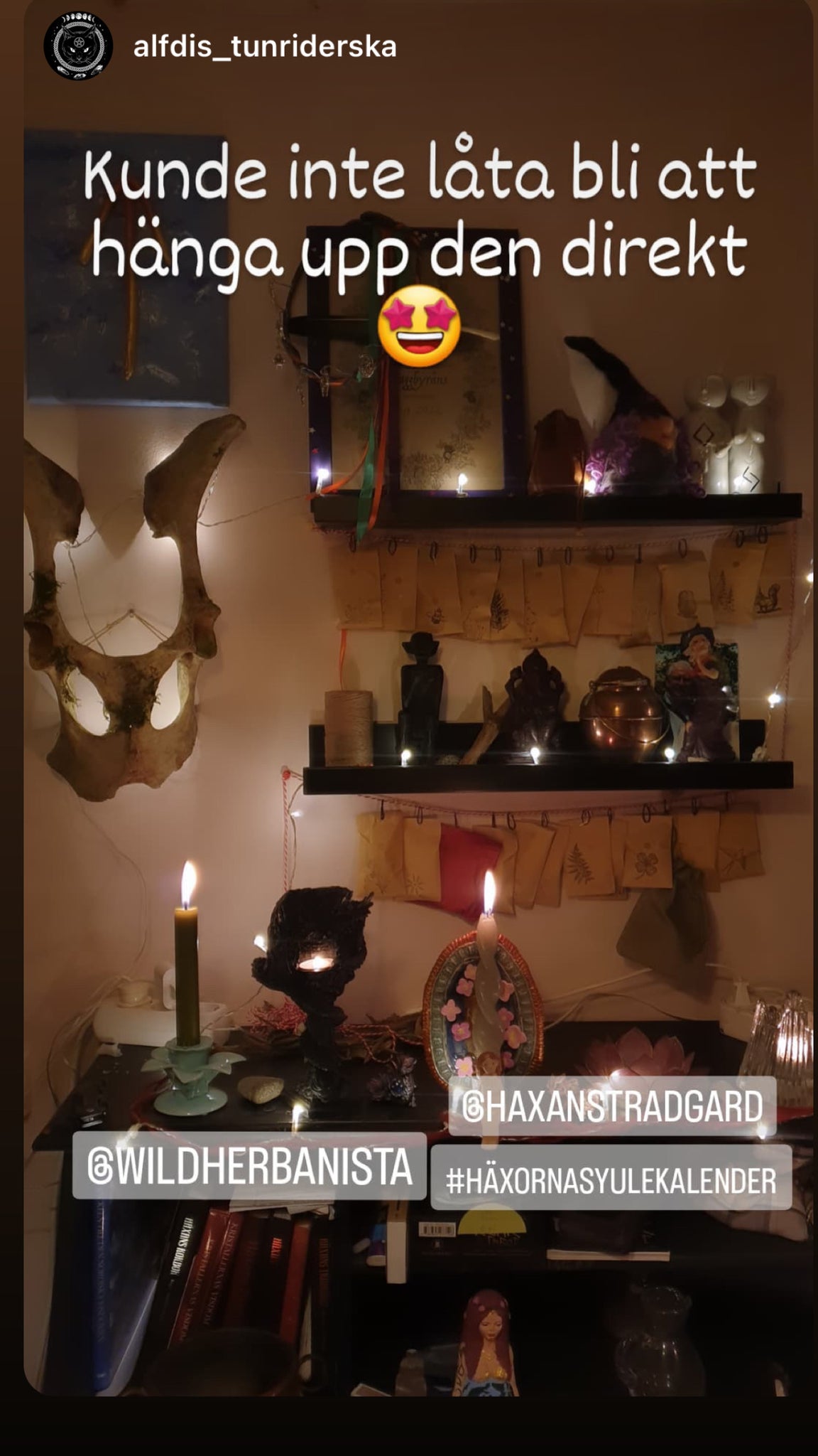 Med kalendern följer ett fint snöre som du kan hänga upp äventyren med. På bilderna ser du exempel på ungefär hur äventyrens innehåll kan se ut, några är från tidigare års kalender. Låt dig inspireras av bilderna där tidigare köpare gjort häxiga arrangemang med sina Yulekalendrar. Skicka gärna bild till mig på hur du arrangerar din yulekalender, till hella@haxanstradgard.se