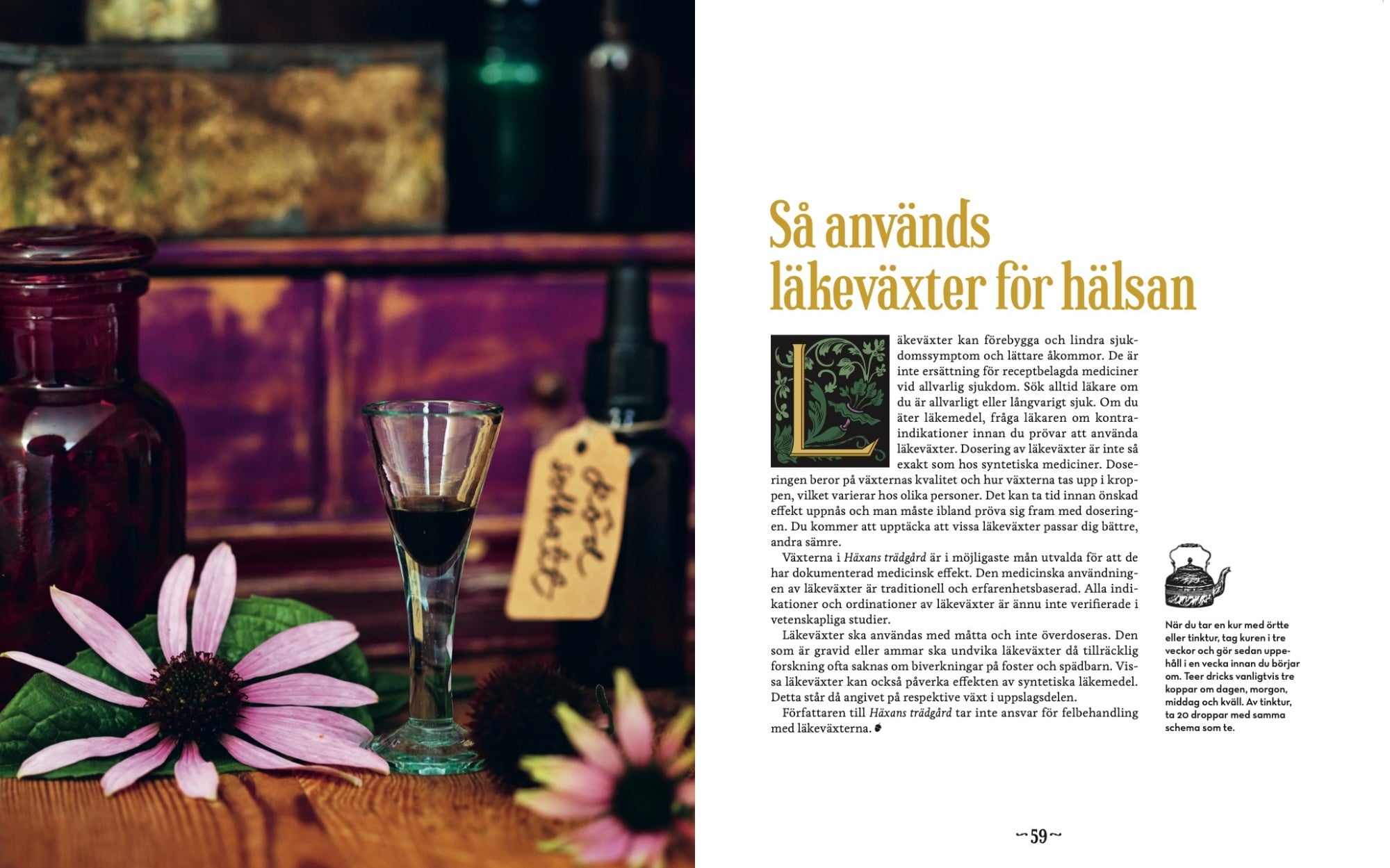 Du får recept på örtte, tinktur, salva, med mera. Boken ger handfasta tips på hur och var växterna hittas, odlas, skördas och förvaras. Här ges även inblick i hur nutida häxor arbetar, och exempel på hur växer kan användas i magiska ritualer och amuletter - allt förankrat i nordisk folkmedicin och magiska traditioner.